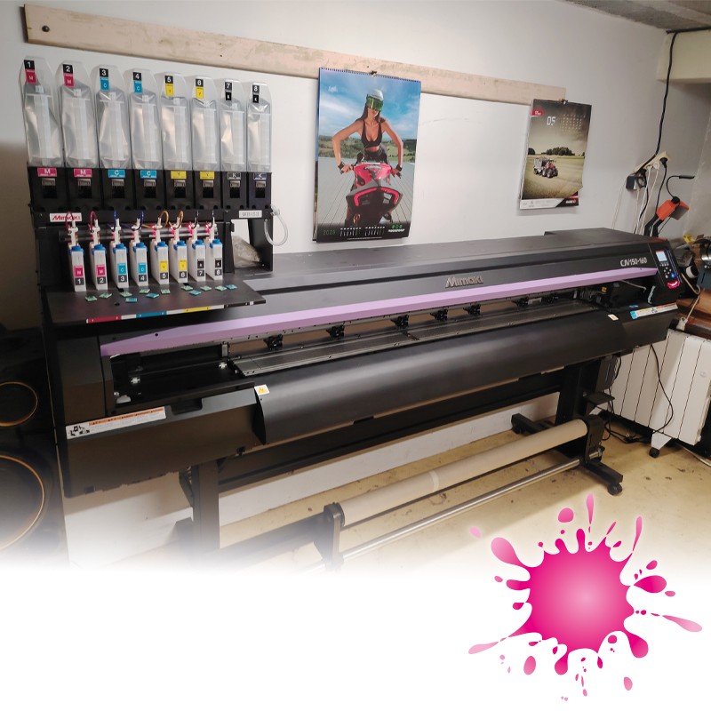 Nouvelle imprimante de production Mimaki avec un nouveau système d'entraînement du support qui améliore la stabilité. Nombreuses configurations d'encre possibles.
